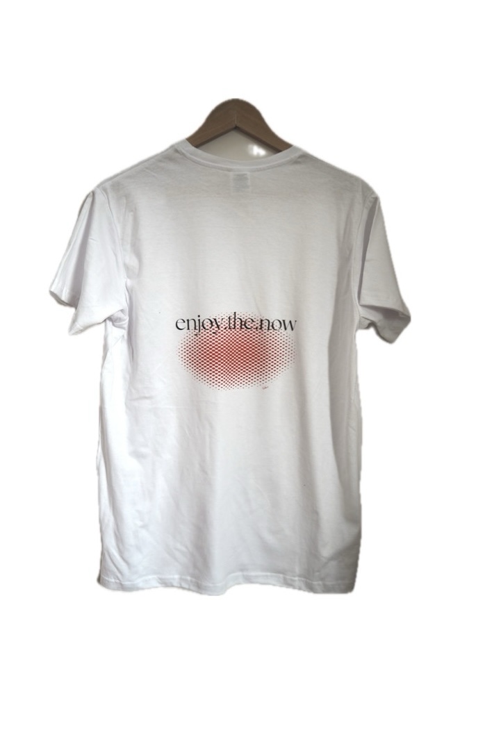 Dieses Shirt wird mit dem Aufdruck auf dem Rücken ,,enjoy the now“ verkauft. Die Farbe der Form kann man frei auswählen.